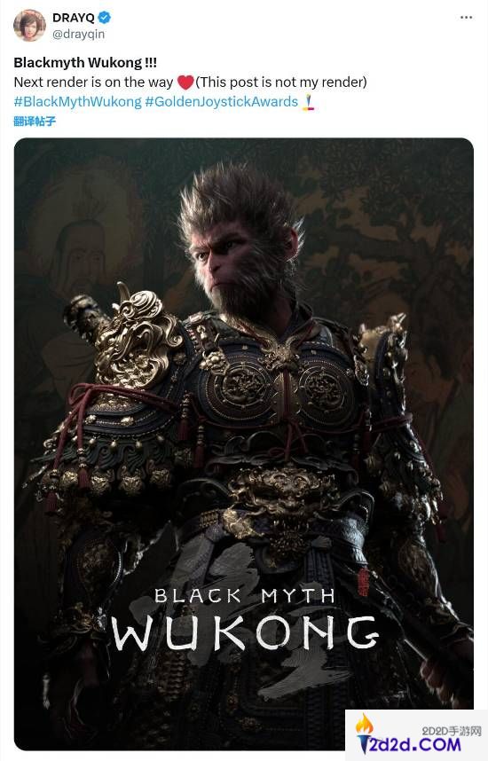 而在金摇杆年度游戏大奖正式颁发,《黑神话:悟空》喜提桂冠时,他也发推进行了祝贺,同时表示《黑神话》主题的下个3D作品正在制作当中。为避免误会,他特别提醒推文下面带的是官图,不是他渲染的。期待他的下一个作品。