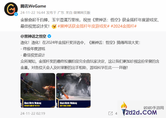 腾讯WeGame官方日前也对《黑神话:悟空》进行了祝贺,说道:“金猴奋起千钧棒,玉宇澄清万里埃。祝贺《黑神话:悟空》获金摇杆年度游戏奖、最佳视觉设计奖!”