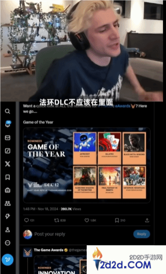 但鉴于官方此前特意修改规则,以及本体游戏在2022年就拿过TGA年度游戏,有不少玩家认为今年的年度游戏还会是Fromsoftware的。但国外顶流游戏主播XQC却不这么认为,在直播中亲自给《黑神话》投票,还列举了几条《黄金树》不配拿年度游戏的原因: