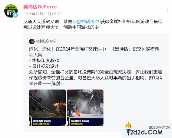 在2024年金摇杆奖颁奖仪式上,众多游戏获得了大奖,其中《黑神话:悟空》获得“年度终极游戏”与“最佳视觉设计”两项大奖,让无数玩家为之振奋。与《黑神话:悟空》拥有合作关系的英伟达官方日前也进行了祝贺,并表示《黑神话:悟空》创造了中国游戏历史。