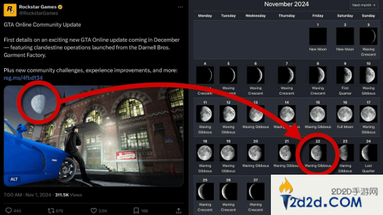 事件起因是有玩家称R星在2023年9月公布的《GTAOL》中秋节活动宣传图中,月亮的月相与去年12月1日现实中的月相相吻合,也正是在去年的12月1日,R星官宣了《GTA6》首支预告的公布日期。而在《GTAOL》今年的新宣传图中,月亮的月相与今年11月22日现实中的月相相吻合,许多网友便开始猜测《GTA6》的新消息会在11月22日到来。