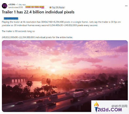 近日有玩家在Reddit论坛发帖,表示《GTA6》的首支预告片有224亿个像素点。“在4K分辨率下播放预告片的话,每帧有3840x2160=8294400个像素,假设预告片在YouTube上的播放帧率为30帧每秒,即每秒包含30帧画面,那么每秒的像素总数为8294400x30=248832000个像素。而预告片的时长为90秒,因此整个预告片的像素点为22394880000个。”