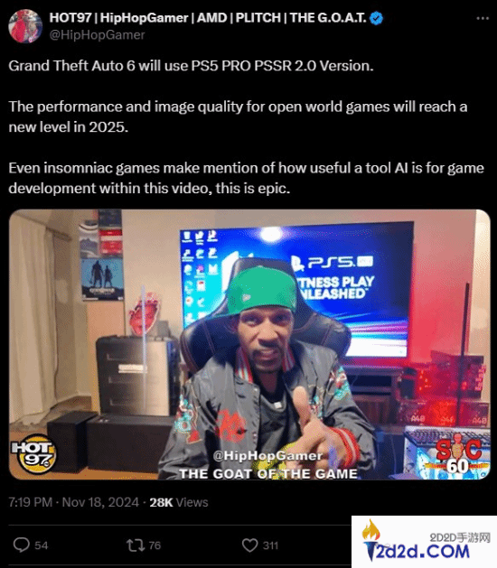 外网知名爆料人HipHopGamer称《GTA6》将在PS5 Pro上获得出色的增强支持,利用“PSSR 2.0”AI增强技术实现惊人的“图像重建”效果,为游戏提供更高的视觉效果,同时保持优秀的性能表现。此外,他还透露,R星与索尼计划将《GTA6》与PS5 Pro主机捆绑销售。目前这些消息没有官方证实。