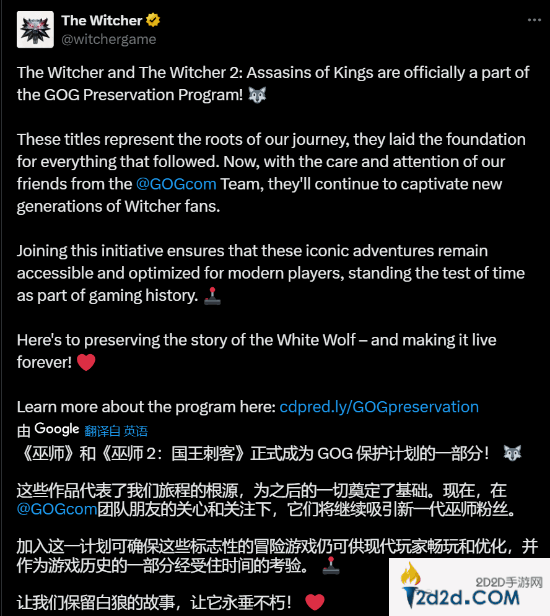 此前盟里手游网曾报道,CDPR旗下的GOG平台推出经典游戏保护计划。今日《巫师》官推发文称,《巫师1》和《巫师2:国王刺客》均已加入该计划。