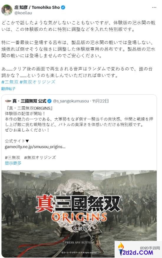 《真三国无双:起源》已经开启试玩,体验过的玩家就会发现,汜水关之战的吕布属实神勇,超高难度让不少玩家叫苦不迭,游戏初期就有如此强度的BOSS,不敢想正式游戏得有多难……但本作制作人庄知彦近日在推特上表示,玩家大可放宽心,正式版的吕布不会在这关登场: