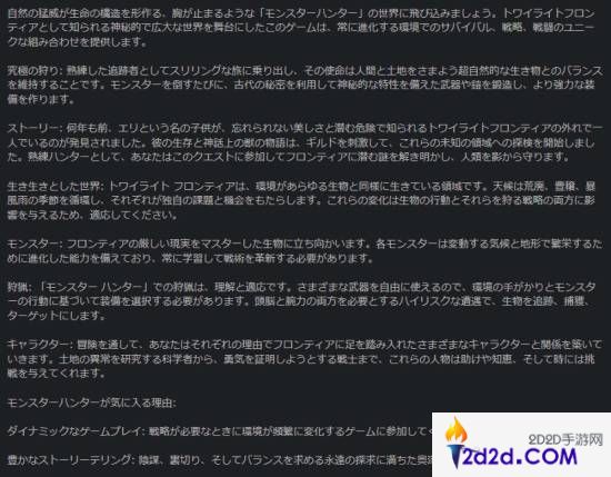 还不止于此,在简介中,游戏如此介绍:在神秘且广阔的世界“黄昏边境”(Twilight Frontier)。玩家将在一个四季循环变化的动态环境中生存,并狩猎怪物。该游戏仅支持离线单人模式。