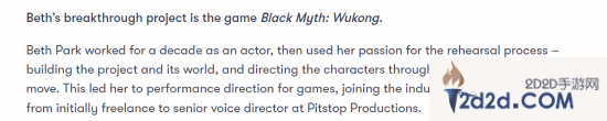 据称,BAFTA是一个相对“学术派”的奖项,它对于游戏的艺术性要求更高也更严格。在对于Beth Park的提名中,BAFTA特别强调,Beth的突破性项目是游戏《黑神话:悟空》。