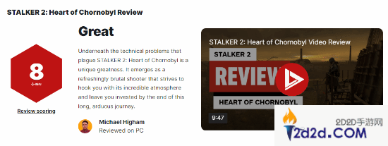 《潜行者2:切尔诺贝利之心》上市四天后,外媒IGN本部发布了游戏的最终评分——8分。IGN此前表示《潜行者2》首发时技术问题和BUG过多,因此无法及时发布完整测评。