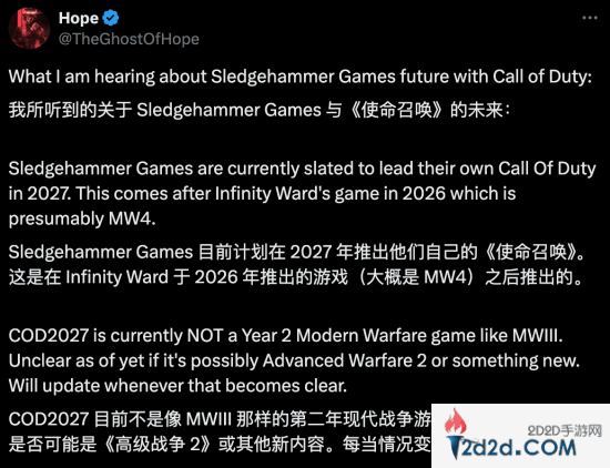 今日,COD爆料人@TheGhostOfHope透露了自己所知道的消息:Sledgehammer Games 目前计划在2027年推出他们主导开发的《使命召唤》新作。2026年预计是 Infinity Ward 带领的《现代战争4》。