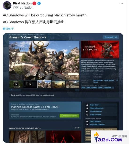 随着发售日越来越近,本作的Steam商店页面也在最近上线,但国外博主“Pirat_Nation”盯着这一日期,发现了一个盲点:2月是美国的黑人历史月。
