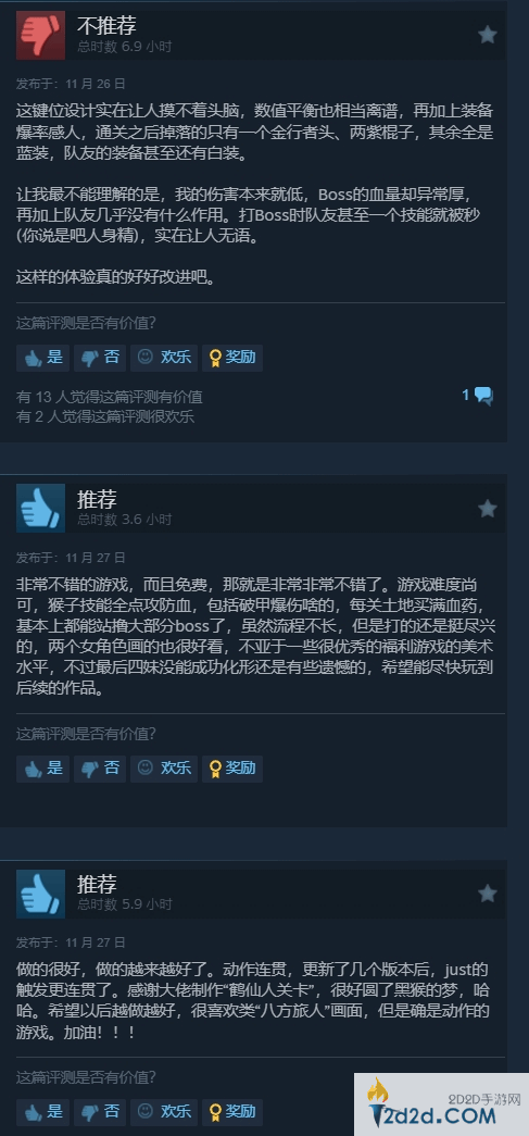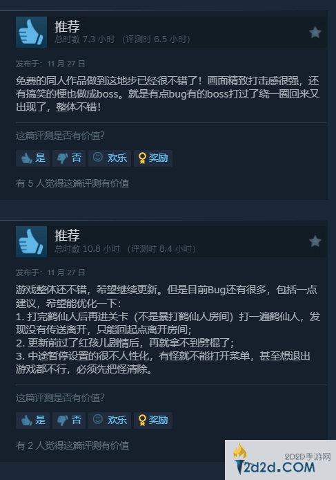 不少玩家评价本作,虽然是免费游戏,但质量可以,中规中矩,像素画面精致,打击感也很强。游戏中还有着不少玩梗元素。作为一款免费的同人作品,已经很不错!