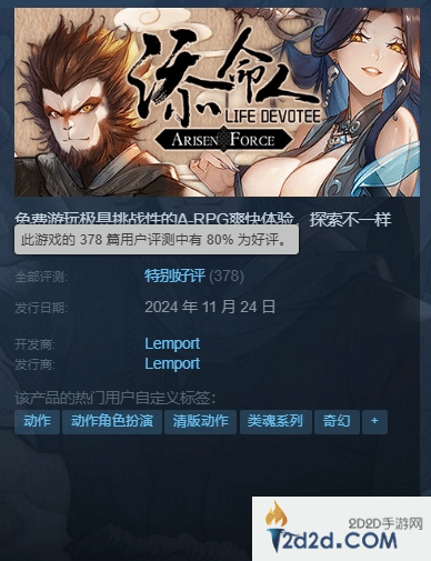 由Lemport开发的像素版黑神话《崛起力量:添命人》已经于11月24日上架Steam。目前本作在Steam的评价为特别好评,378篇用户评测,好评率80%。