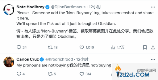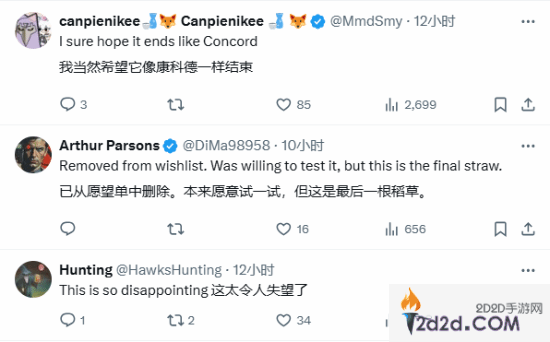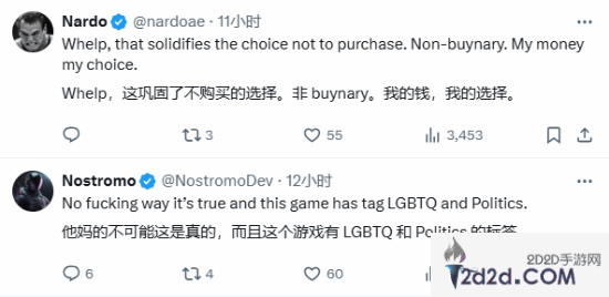 推文随即引发玩家热议,对于《宣誓》出现的争议事件,一些玩家纷纷表示不满:“我的代词是‘not/buying’。”“‘觉醒’彻底毁了游戏。”“《宣誓》和《天外世界》已经让黑曜石陷入了疯狂的深渊。”还有玩家直言:“我希望它会向《星鸣特攻》一样完蛋。”