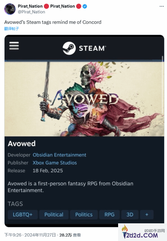黑曜石新作《宣誓》将在2025年2月18日正式发售,但游戏在近期里的争议(性别代词事件、马斯克反击事件等)不断。日前,推主@Pirat_Nation发现《宣誓》Steam页面里出现了“LGBTQ+”、“政治”等标签,并发推表示这让自己想起了《星鸣特攻》。