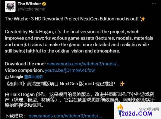 CDPR宣传《巫师3》高清MOD!玩家请愿主机版也更新