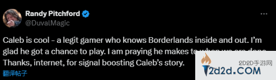 Gearbox CEO Randy Pitchford也发表了感言:“Caleb绝对是《无主之地》的忠实粉丝。我很高兴他能有机会玩到这款游戏。希望他能坚持到我们正式完成游戏的那一天。感谢互联网,让Caleb的故事得以传播。”