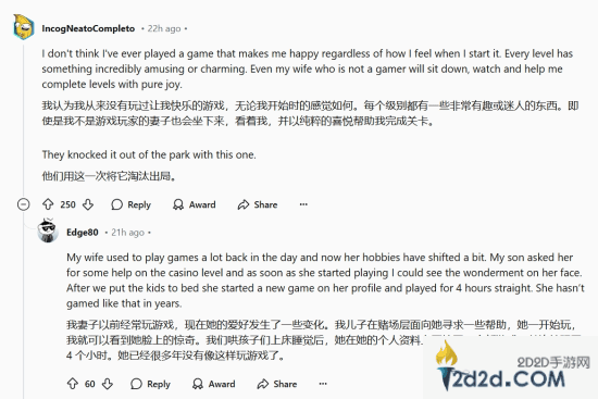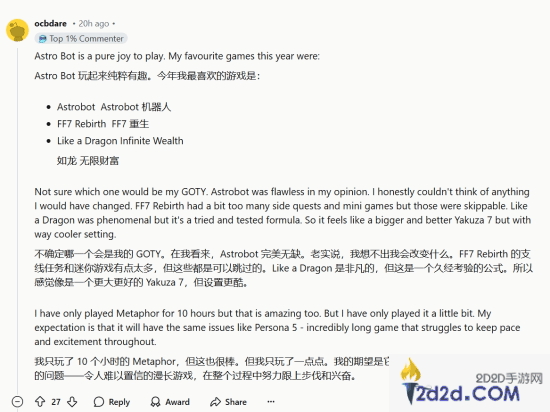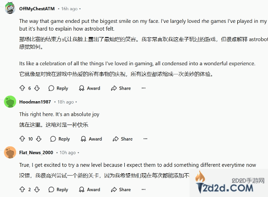 位网友评论中提到:“《宇宙机器人》真的是纯粹的快乐。我今年最喜欢的几款游戏是:《宇宙机器人》,《最终幻想7:重生》,《如龙8:无限财富》。我不确定哪个会成为我的年度游戏。《宇宙机器人》在我看来是完美无缺的,我实在想不出有什么地方可以改进。虽然《最终幻想7:重生》有太多支线任务和迷你游戏,但这些内容可以跳过。至于《如龙:无限财富》,虽然依然沿用了试过的公式,但它在设定上更加酷炫,感觉像是一个更大、更好的《如龙7》。”