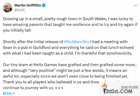随后,《无人深空》引擎程序员Martin Griffiths也发推表达了一些感想,并表示《无人深空》距离做完还有着一段时间。“我在南威尔士的一个小镇长大,那里环境相当艰苦。但我很幸运有一对了不起的父母,他们教会了我坚韧不拔,教会了我如果初次失败就要不断努力、再试一次。”