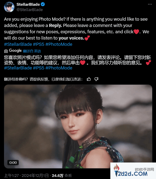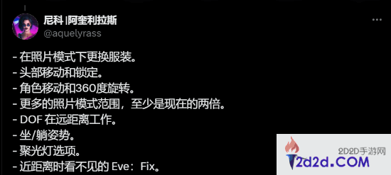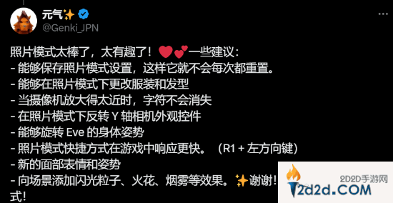 《剑星》拍照功能已于11月20日更新,游民老哥们有没有拍伊芙的美照呢?官方今日发文,询问玩家们对拍照功能的满意度,并欢迎提出新姿势、表情或者功能累的建议,官方会尽力倾听。