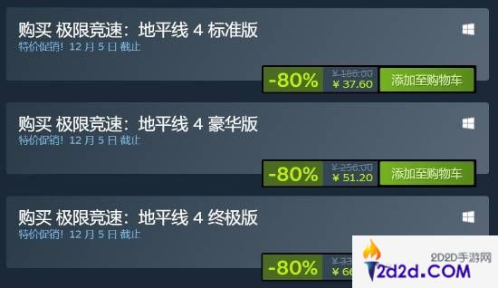 本作正在Steam、Xbox、MicroSoft Store等平台优惠促销中,史低骨折-80%。标准版37.6元、豪华版51.2元、终极版66.6元。Steam好评率高达90%,感兴趣或者想收藏的玩家,可以把握最后的机会。当然,对于竞速爱好者来说,也可以选择最新作《极限竞速:地平线5》。