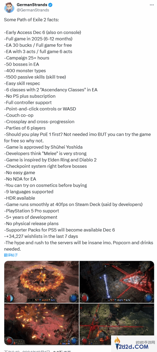 《流放之路2》即将于12月6日正式上线EA版本,推主@GermanStrands日前总结了《流放之路2》包含的诸多特性,其中谈到了游戏将支持PS5 Pro,还有超过25小时的战役与400种怪物,一起来看下。