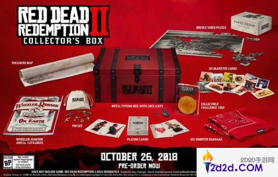 《荒野大镖客:救赎2》典藏铁盒包括一枚纪念币、一组以游戏中武器为造型的六只装胸针、一本150页的攻略书、一张藏宝图、12张香烟卡、一套特别的扑克牌、一条方巾以及双面拼图等等,当年的售价仅需99美元。