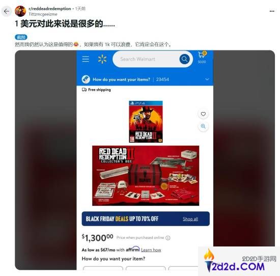 Reddit论坛有玩家趁着黑五逛亚马逊时发现,发售六年的《荒野大镖客:救赎2》典藏版的售价变得非常高,足足有1300美元(约人民币9415元),简直贵得离谱。