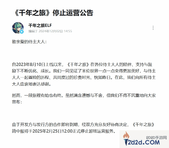 今日,由B站代理发行的二次元游戏《千年之旅》官方发布公告,正式宣布《千年之旅》简中服将在2025年2月25日12:00停止运营服务。