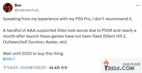 据外媒gameranx报道,知名R星博主@videotechuk_日前表达了自己对于PS5 Pro的一些想法,认为玩家们最好等到2025年再购买PS5 Pro。@videotechuk_说道:“就我个人使用PS5 Pro的经验而言,我不推荐购买。由于PSSR的原因,一些3A游戏的表现效果看上去更差,而且在发布近一个月后,《寂静岭2:重制版》等游戏的表现效果看上去更差,等到2025年再买这玩意儿吧。”
