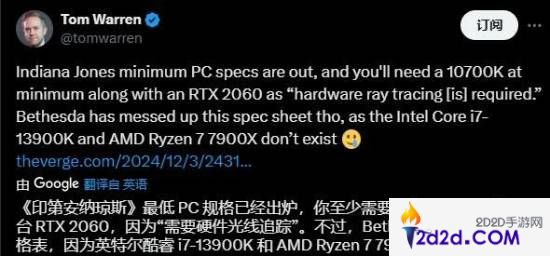 Tom Warren表示,B社连配置需求表都能搞砸,因为“极佳配置”中的“Intel Core i7-13900K”和“AMD Ryzen 7 7900X”是完全不存在的处理器。