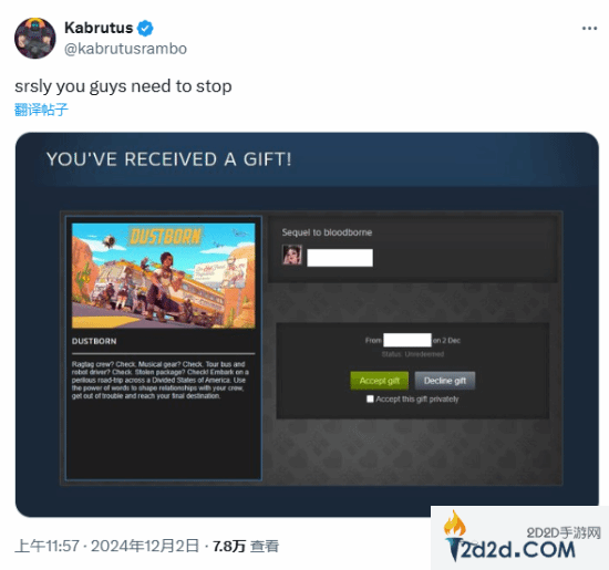 据tech4gamers报道,《尘路之旅》的事迹在玩家群体里俨然成为了笑话,一些玩家开始在Steam上互赠这款游戏,纯粹是为了恶搞对方,利用它扑街的名声来获得乐趣。曾创办DEI游戏监测网站的推主@kabrutusrambo日前收到了一份《尘路之旅》Steam礼物,赠送者却称这是《血源》续作,这让@kabrutusrambo哭笑不得,说道:“说真的,你们可别做这件事了。”