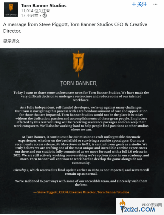 据外媒gamedeveloper报道,Torn Banner Studios官宣了裁员的消息。首席执行官Steve Piggott日前在领英发布了一篇声明,表示《地狱已满2》为工作室的核心之作,正全力以赴确保游戏能在2025年正式推出1.0版本。工作室还正在积极开发路线图里提到的每一项内容,并与社区一起努力开发。