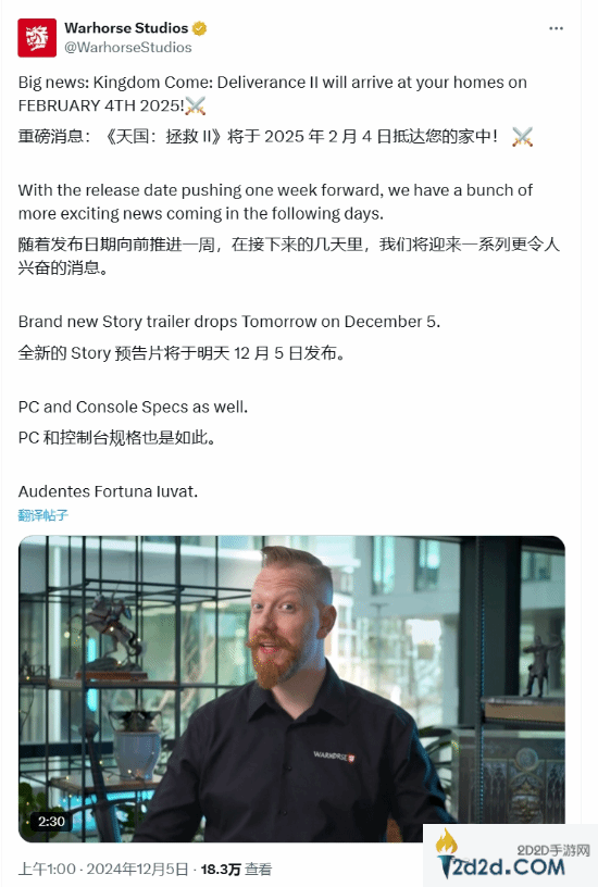 开发商Warhorse Studios宣布,《天国:拯救2》的发售日期将提前一周,原定于2025年2月11日的游戏现在将于2025年2月4日正式上市。