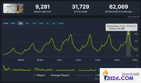 根据SteamDB数据,《刺客信条:奥德赛》这几日的玩家数量暴增,尤其是12月4日同时在线峰值高达31729人。对于一款发售已六年的游戏来说,这个数据还是不错的,差不多是发售以来峰值62069人的一半。