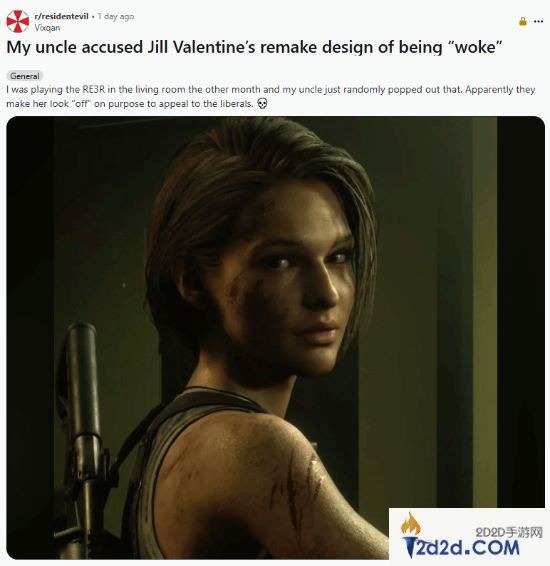 在《生化危机3:重制版》里,经过重新设计的吉尔形象让众多玩家啧啧称赞。有玩家日前在Reddit论坛发帖,称自己的叔叔认为吉尔的形象设计充斥着“觉醒”风格。