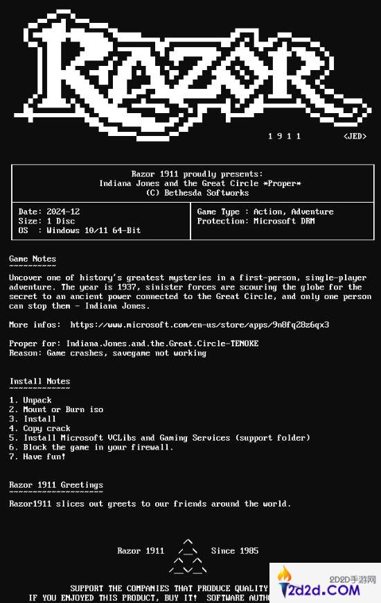 近日,博主@Pirat_Nation发文称,《夺宝奇兵:古老之圈》已经被破解,并展示了一张Razor1911破解组的图片。这一消息引发了玩家和业内人士的关注。