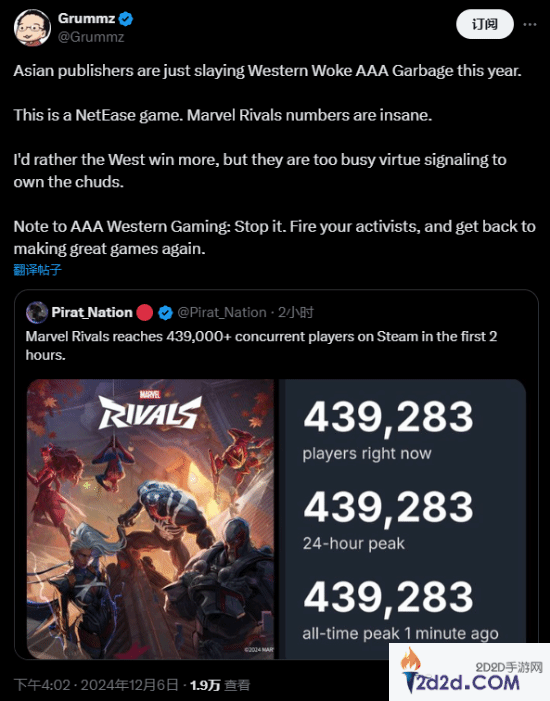 《漫威争锋》火爆的热度也吸引了不少国外玩家的关注。前暴雪制作人Mark Kern发文称赞这款来自网易的英雄射击游戏首发表现非常惊人,认为这就像是一个缩影:“今年亚洲团队的游戏完爆了西方的觉醒3A垃圾作品。”