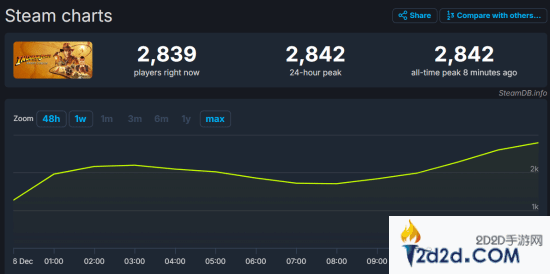 截至发稿前,在Steam平台里游玩《夺宝奇兵:古老之圈》的玩家不断增多,最高峰值已经达到了2842人,鉴于游戏当前还处于抢先体验阶段,相信其正式发售之后的游玩人数会更多。