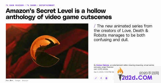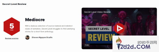 《爱、死亡和机器人》团队原创动画剧集《秘密关卡》将于12月10日正式开播,剧集讲述多个基于电子游戏的故事,IGN为剧集给出了5分的评价。