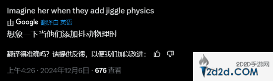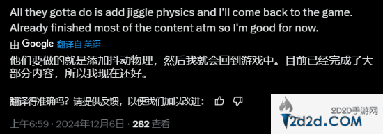 此外还有网友提到,“想象一下未来更新了“物理抖动加强”以后吧!”此前我们曾报道过,《第一后裔》开发者TFD_PD_Lee在Discord上表示,未来将会正式添加“物理抖动”,让角色的一些身体部位变得更加“灵动”。