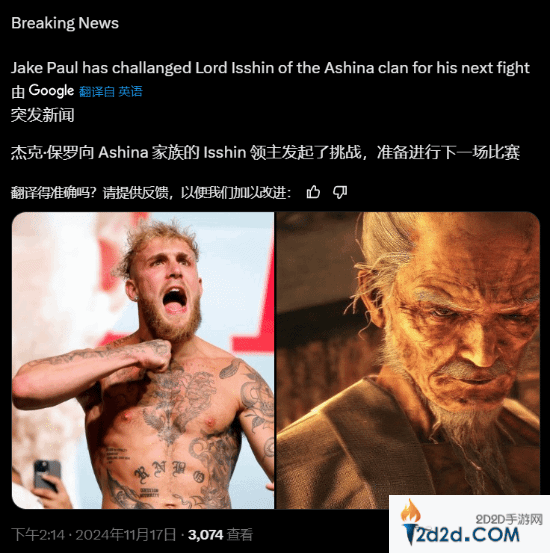 此前我们曾报道过,58岁传奇拳王泰森在11月16日与27岁美国视频网红杰克·保罗展开对决。最终泰森打满8回合,点数不敌27岁杰克·保罗。杰克·保罗获胜后,被玩家们戏称“打老头”专业户,掀起一阵梗图狂潮。