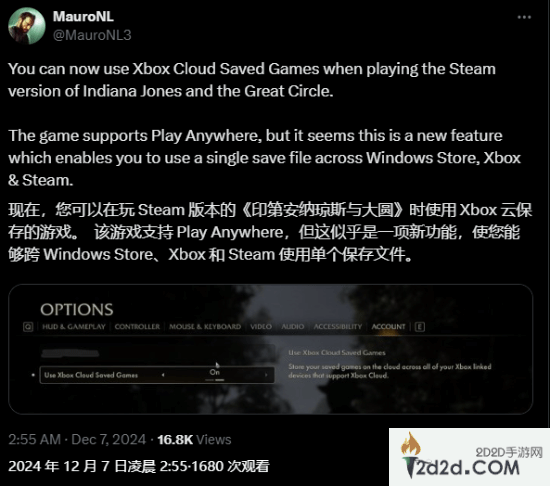 玩家发现,该作的Steam版本也支持Xbox云存档,也就是该作的主机版本和Steam版本存档可以互通,更方便多平台玩家。