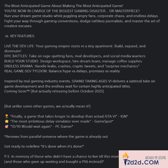 详情页面显示,《Grand Taking Ages VI》将于2025年5月份发售。商店页面的简介也让人绷不住,甚至还有官方自己撰写的来自IGN、GS、PC Gamer等媒体的分数评价。