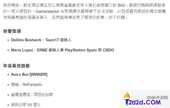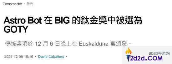 外媒Gamereactor报道了西班牙钛金奖(BIG's Titanium Awards)的结果,《宇宙机器人》被评为年度最佳游戏。被提名的还有《暗喻幻想》、《最终幻想7 重生》、《塞尔达传说:智慧的再现》。