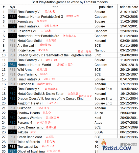 为了庆祝PlayStation诞生30周年,近日知名日本游戏媒体Fami通进行了一项民意调查,通过投票选出了所有PlayStation系统上最好的30款游戏。