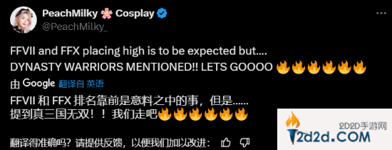 值得一提的是,我们的老朋友《生化危机4:重制版》“艾什莉”体模@PeachMilky也转发了这一排行榜,并表示:“《最终幻想7》和《最终幻想10》排名靠前是意料之中的事,但是榜单里竟然有《真三国无双》!冲冲冲!”