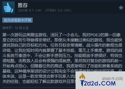 截至发稿前,《流放之路2》在Steam平台的评价已从原来的“多半好评”升至“特别好评”,在24740篇玩家评测里有82%为好评。有玩家表示,《流放之路2》的任务引导做得非常好,即使从未接触过类似游戏的玩家也能快速找到自己的目标和方向,任务目标非常清晰,战斗操作的教程也很详细,毫无上手难度。