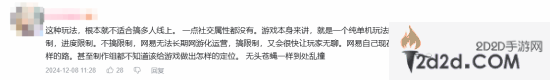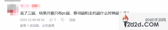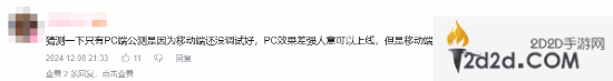 除此之外,也有玩家不满意游戏公测的时间,认为时间刚好在上班族最忙的时候。还有玩家说道:“说了三端,结果开服只有PC端,移动端和主机端什么时候端上来?”