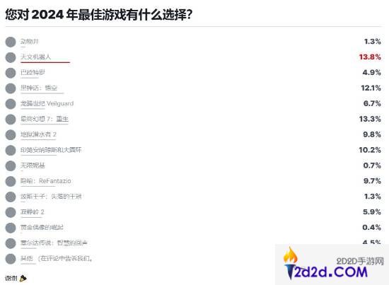 IGN年度游戏大奖投票中:目前《黑神话》排名第三 《宇宙机器人》第一名