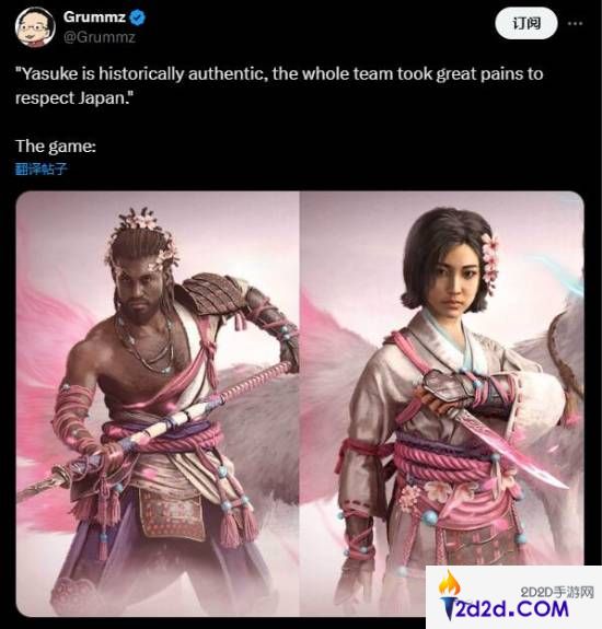 盟里手游网上个月报道,《刺客信条:影》的部分装备宣传图曝光,其中有一套是樱花味十足的甲胄。奈绪江既不失忍者的冷酷又增添了一份姿色,而坦胸露乳的黑哥弥助实在让人绷不住。游戏博主Grummz也用这张图发文嘲讽育碧,并引用官方的话:“弥助是符合历史的,团队尽最大程度尊重日本。”
